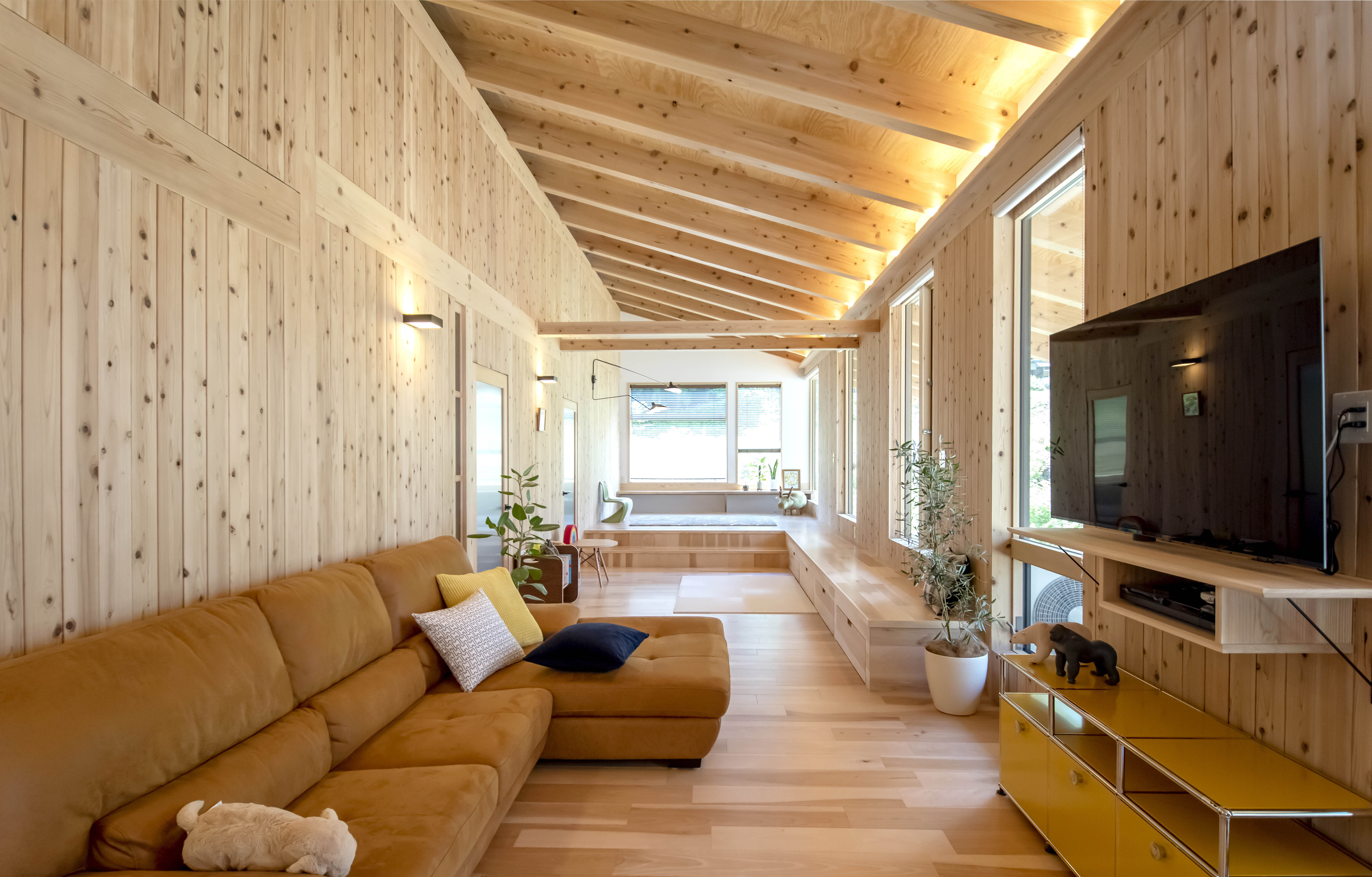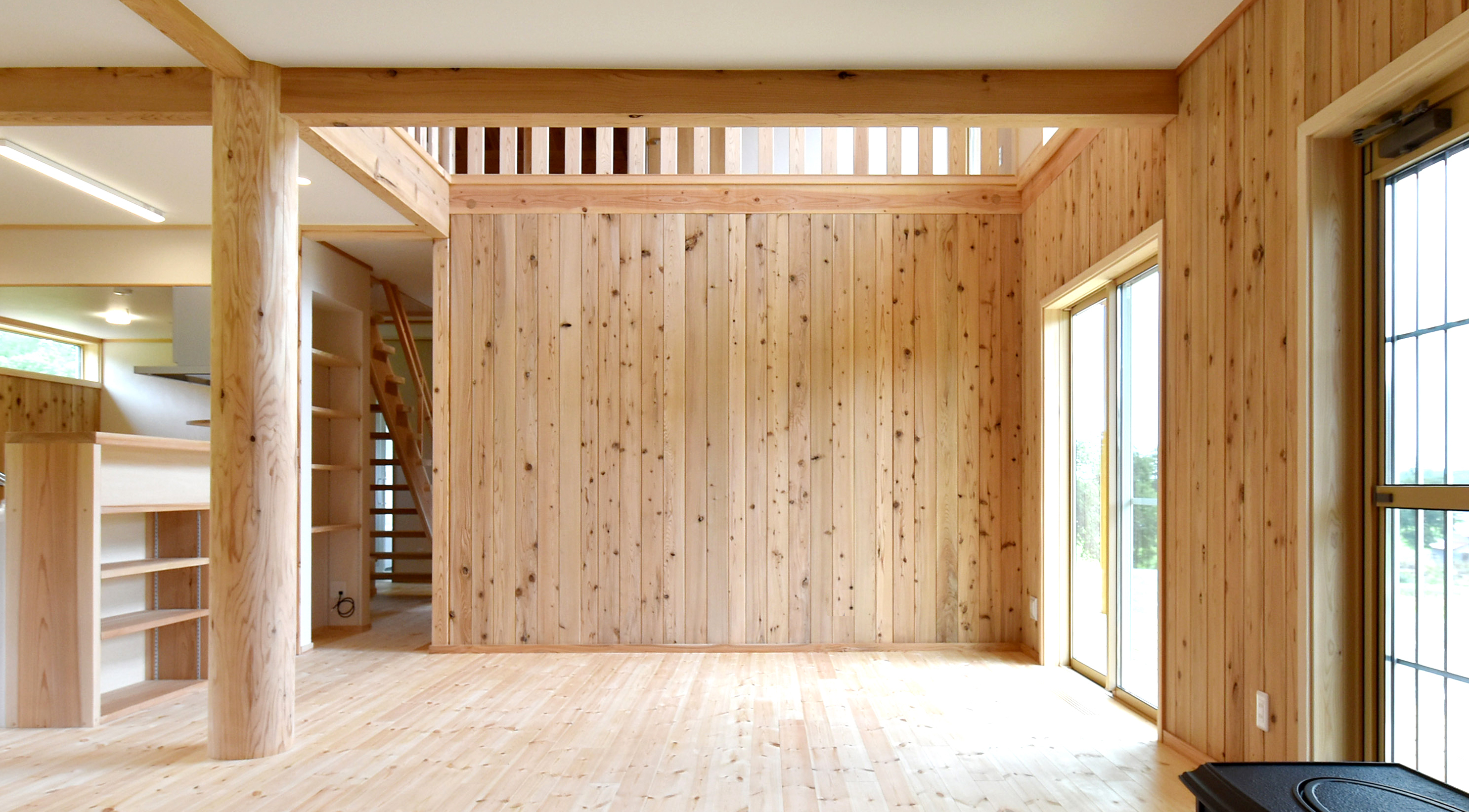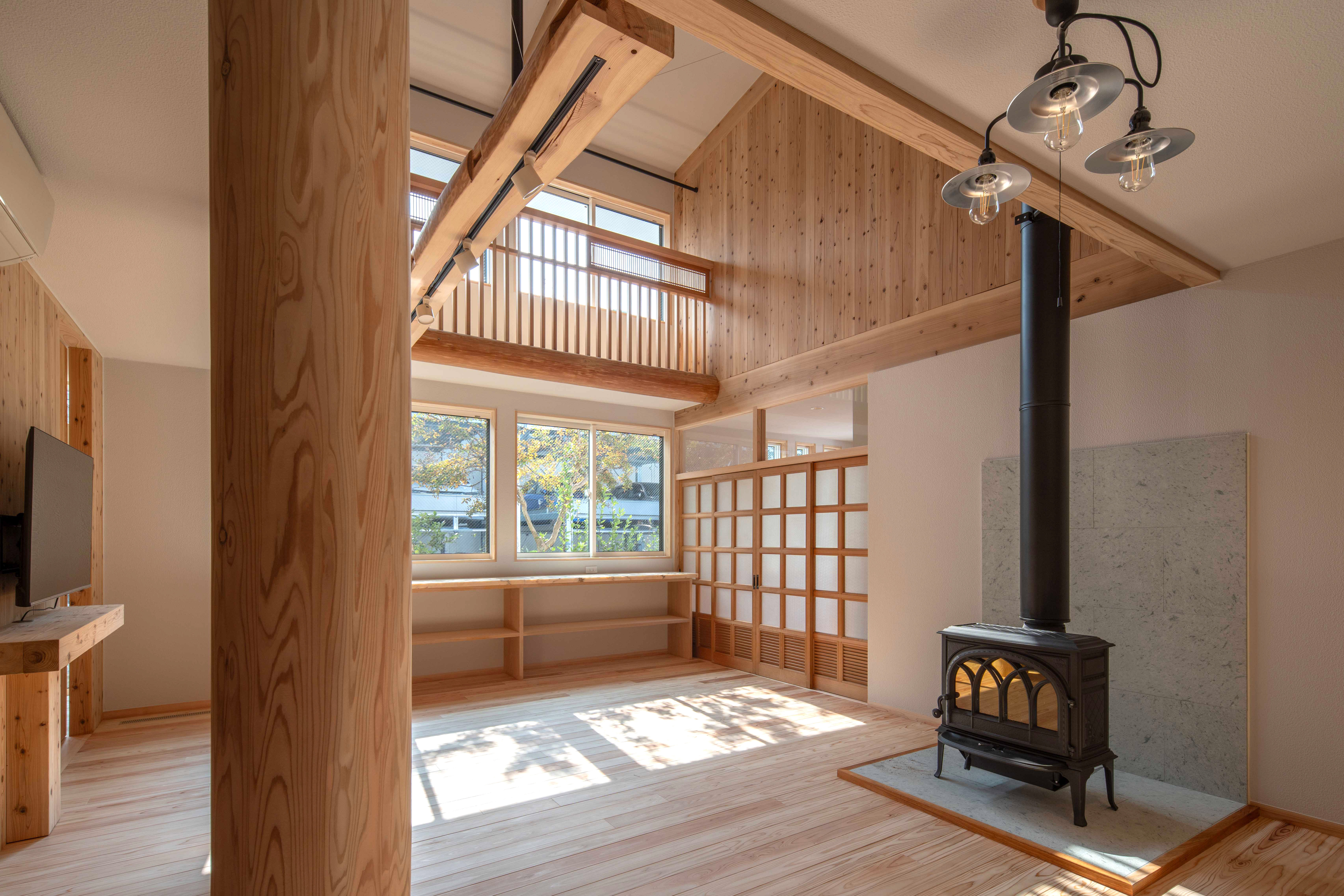 ログハウスのような木のぬくもりと上質な住環境性能、現代の暮らしに寄り添う高い断熱性・耐震性能・耐火性能を有する木の建物です。在来軸組工法をベースとし、ログハウス特有の設計の制限を解消しました。