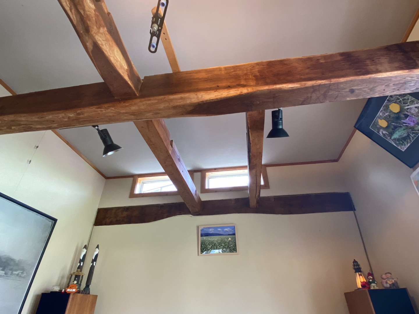 店内には、リフォーム前の梁桁が剥き出しになっており、以前の車庫兼小屋の名残が残っています。