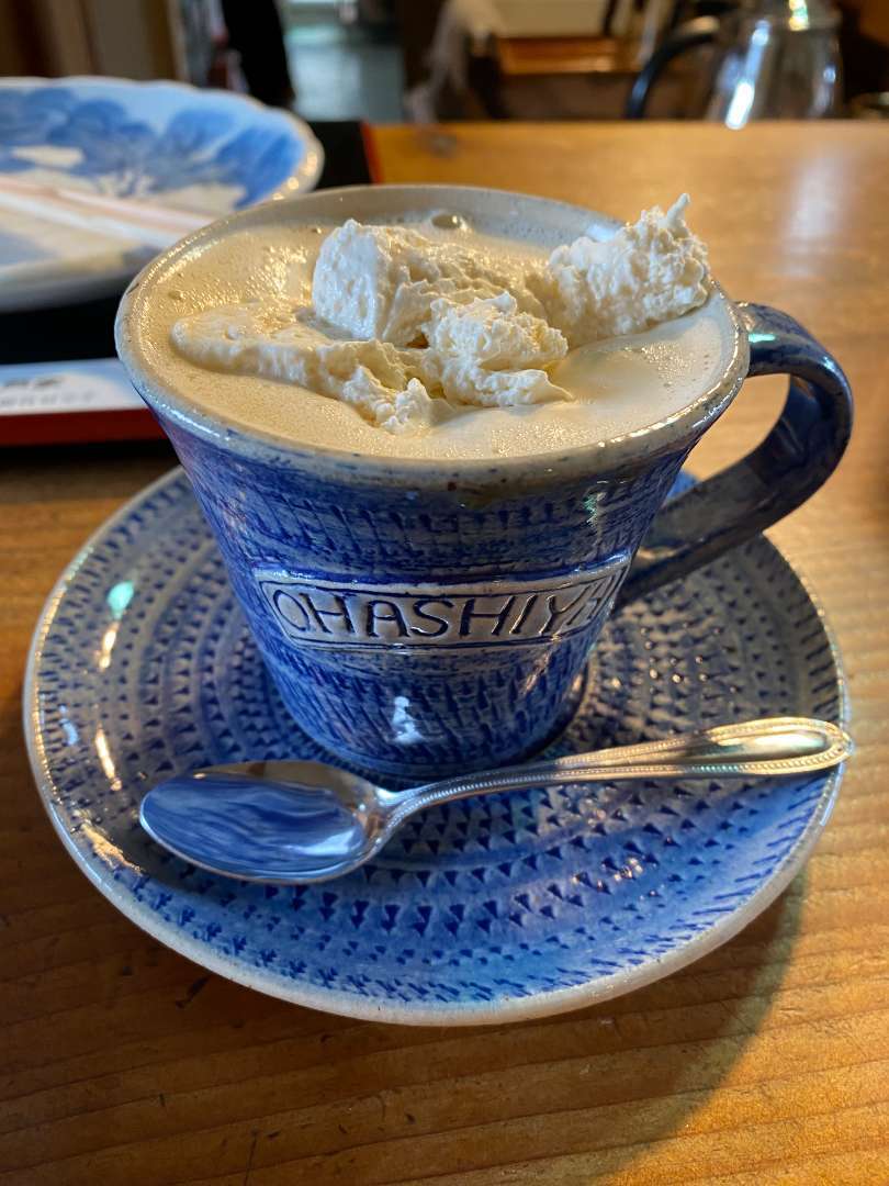 じゅうねん(えごま)入りのチョコケーキとウィンナーコーヒーのセット、じゅうねんのぷちぷちとした食感がクセになる優しい甘さのケーキでした。