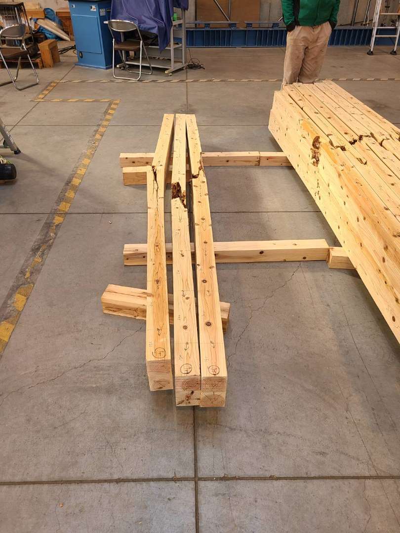 1000kN以内で試験できる試験体を検討して、スギ製材90mm角を2本抱き合わせる試験体を作成しました。