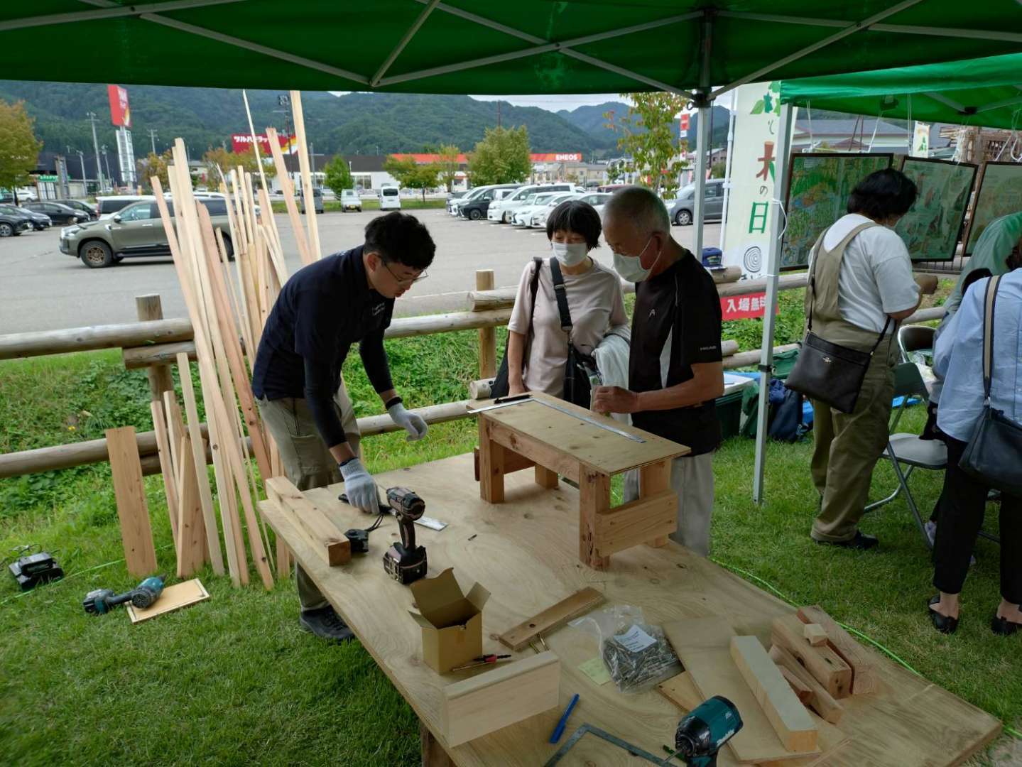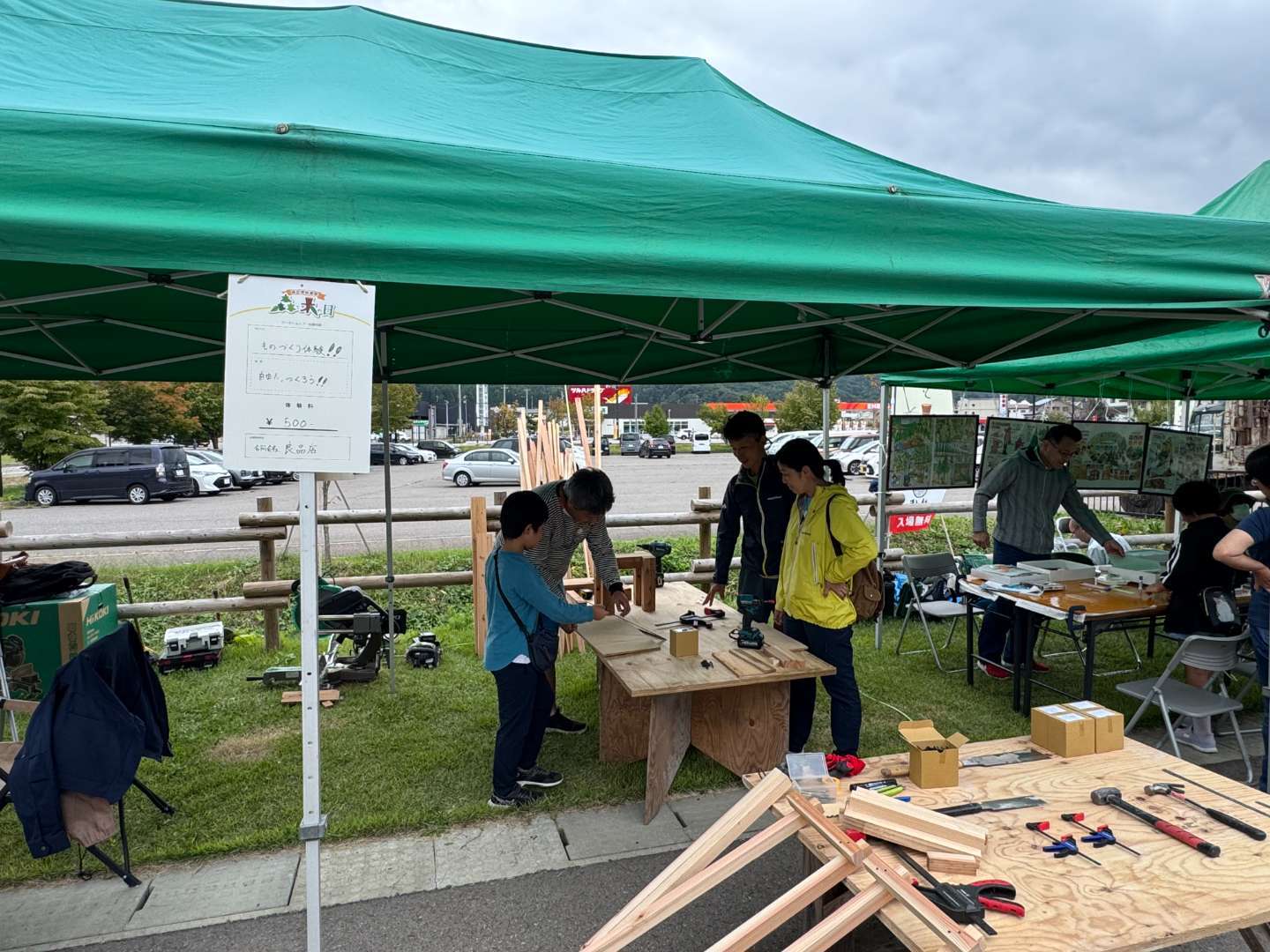 屋外の木工ブースでは、道具や材料を自由に使って好きなものを作る「ものづくり体験」を行いました。