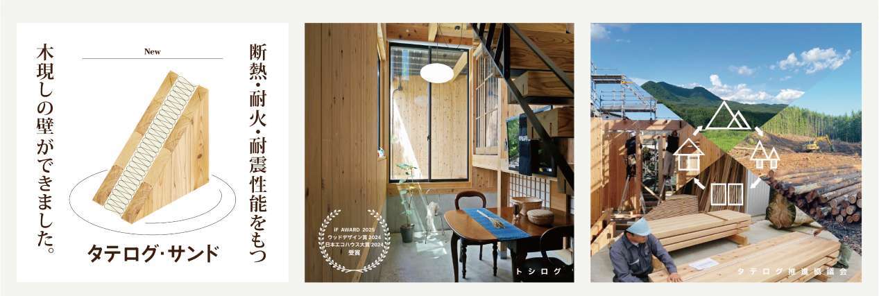 トシログ®︎とは、アトリエM.A.R.(所在:神奈川県藤沢市/代表:梅崎裕子)による、タテログ®︎を用いた「ログハウスならではの木のぬくもり」と、都市のライフスタイルに対応した「第1種換気システム」や「オフグリッド可能な給電方法」などの快適な住環境を併せ持つ建物です。iF AWARD2025、ウッドデザイン賞 2024、日本エコハウス大賞 2024を受賞しています。
