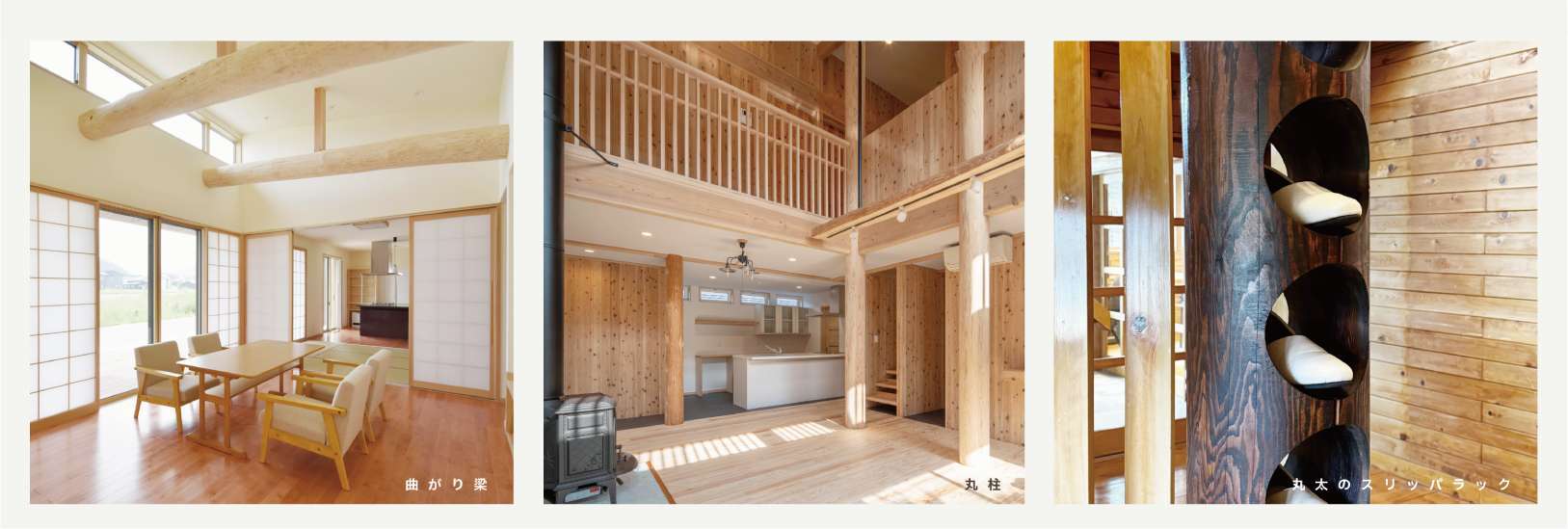 自然が創り出す木の凹凸や風合いは、ひとつとして同じものがなく、唯一無二のかたちをしています。木の力強さと美しさを感じる曲がり梁は、ひときわ存在感を放ちます。