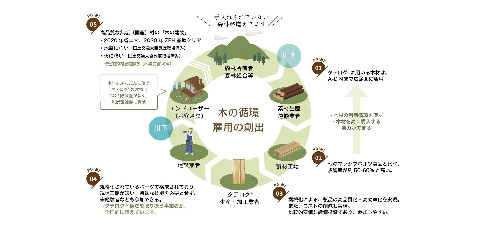 効果は伐採され木材となり家になっても変わりません。築50年の木造建築物では、その50年間、二酸化炭素を固定していると言えます。伐採された跡地に植林することで、そこで育つ木々は、新たに大気より二酸化炭素を吸収し生長します。